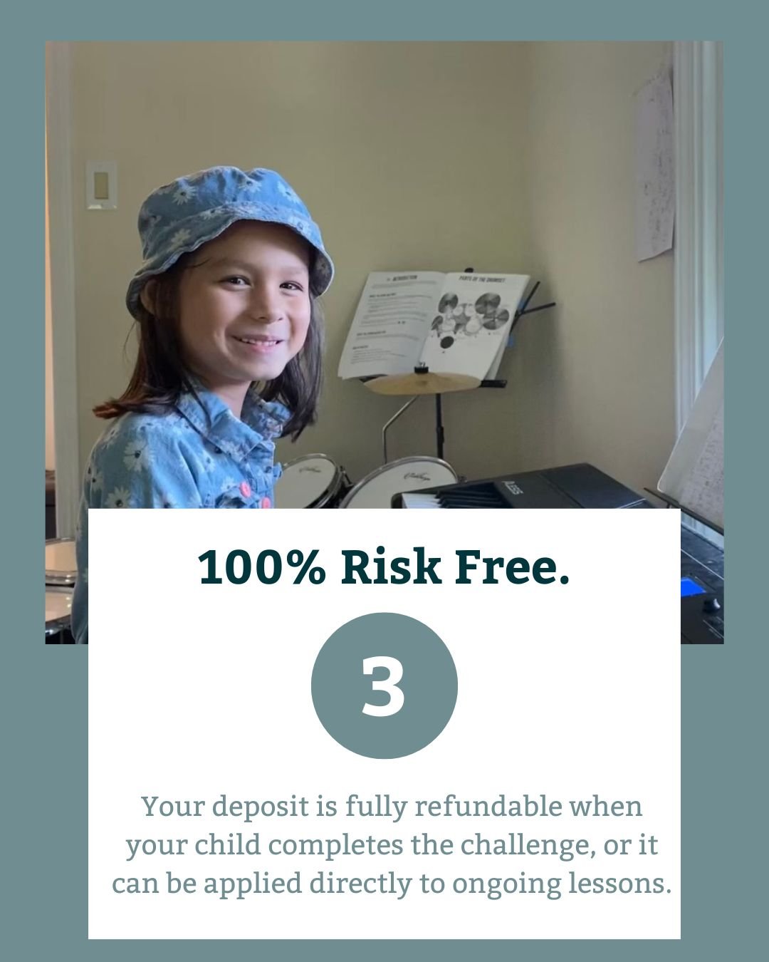 In just 6 weeks, your child will take 6 private lessons, learn 16+ mini songs, and build the foundation of piano. Complete the challenge, and you can choose if your deposit is fully refunded or applied to future lessons - plus you’ll get a transformation video and a certificate to celebrate the win.